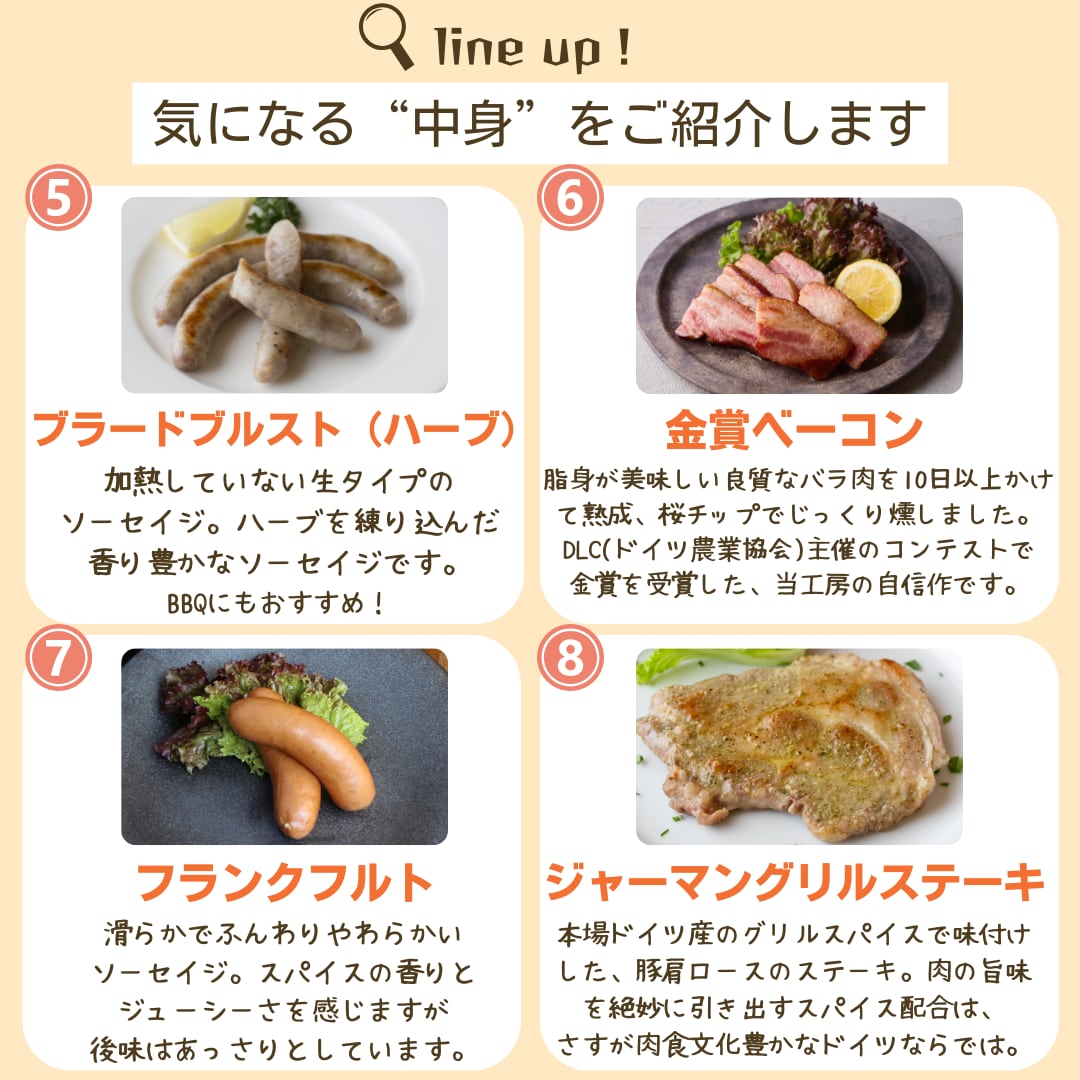 野菜ウインナー / 粗挽きソーセイジ / チョリソー / ピザケーゼ または トマトとチーズのスライスソーセイジ / ブラードブルスト / 金賞ベーコン 180g / フランクフルト / ジャーマングリルステーキ 180g